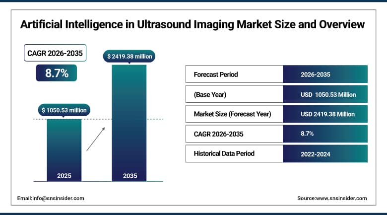 Ans: The Artificial Intelligence in Ultrasound Imaging Market Size was valued at USD 1050.53 Million in 2025 and is expected to reach USD 2419.38 Million by 2035 and grow at a CAGR of 8.7% over the global forecast period of 2026-2035.