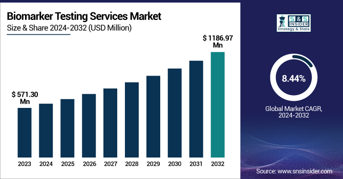 The Biomarker Testing Services Market was valued at USD 571.30 million in 2023 and is expected to reach USD 1186.97 million by 2032, growing at a CAGR of 8.44% from 2024 to 2032.