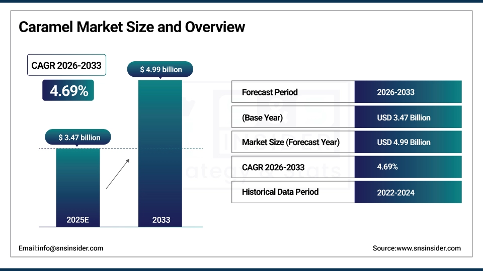 The Caramel Market Size is valued at USD 3.47 Billion in 2025E and is projected to reach USD 4.99 Billion by 2033, growing at a CAGR of 4.69% during the forecast period 2026–2033.
