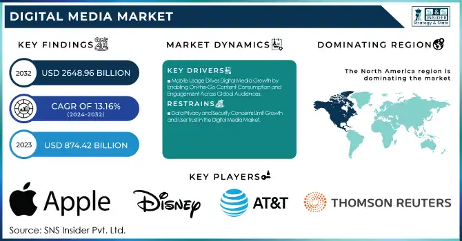 The Digital Media Market was valued at USD 874.42 billion in 2023 and is expected to reach USD 2648.96 billion by 2032, growing at a CAGR of 13.16% from 2024-2032. This growth is driven by evolving consumer behavior trends, with an increasing shift toward digital content consumption and changing ad spend distribution. Content consumption patterns are influenced by the rise of streaming services, mobile platforms, and interactive media. Technology adoption plays a pivotal role, with advancements in AI, VR, and AR transforming digital media experiences, further fueling market expansion and reshaping advertising strategies.