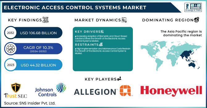 The Electronic Access Control Systems Market Size was valued at USD 44.32 Billion in 2023 and is expected to reach USD 106.68 Billion by 2032 and grow at a CAGR of 10.3% over the forecast period 2024-2032. The Market is growing rapidly due to rising security concerns across commercial, residential, and government sectors. These systems enhance security with biometrics, cloud computing, and IoT integration. Key drivers include urbanization, smart building adoption, and regulatory mandates. The shift toward mobile-based access and multi-factor authentication is reshaping security models. Cloud-based solutions are gaining traction for scalability and remote monitoring. Companies invest in AI-driven facial recognition, touchless authentication, and blockchain for secure identity management. Advancements in wireless technology and smart locks continue to drive innovation, shaping the future of access control solutions.