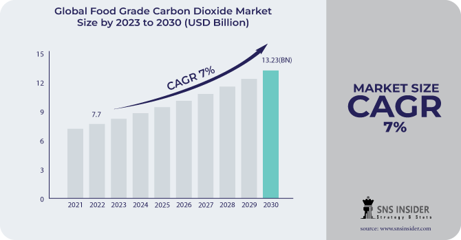 The Food Grade Carbon Dioxide Market size was valued at USD 7.7 billion in 2022 and is expected to grow to USD 13.23 billion by 2030 and grow at a CAGR of 7 % over the forecast period of 2023-2030.