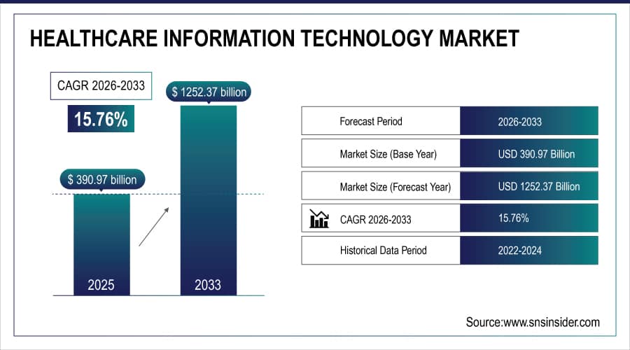 The Healthcare Information Technology Market was valued at USD 390.97 billion in 2025E and is expected to reach USD 1252.37 billion by 2033, growing at a CAGR of 15.76% from 2026-2033.