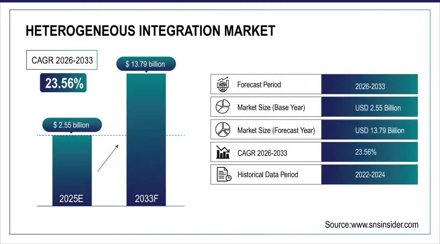The Heterogeneous Integration Market size was valued at USD 2.55 Billion in 2025E and is projected to reach USD 13.79 Billion by 2033, growing at a CAGR of 23.56% during 2026-2033.