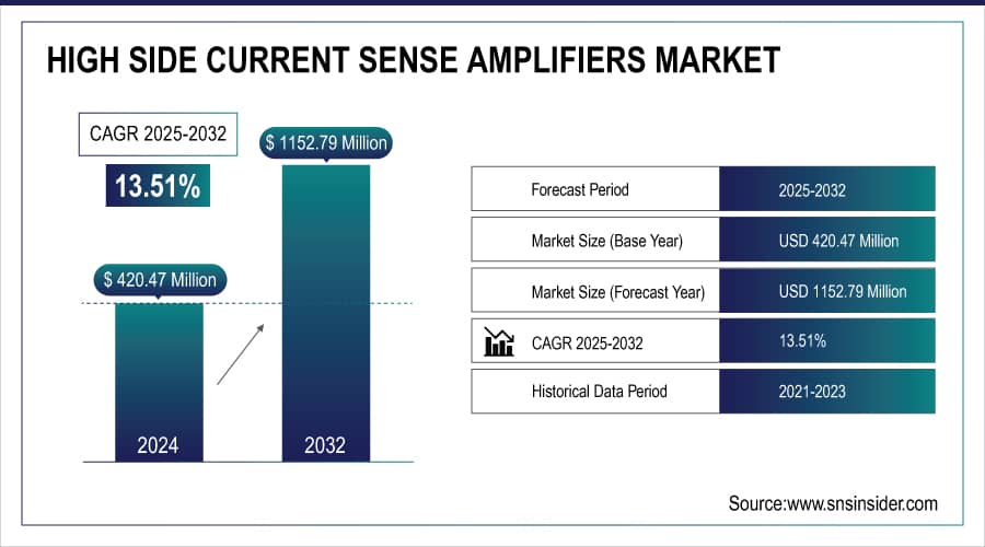 The High Side Current Sense Amplifiers Market size was valued at USD 477.27 million in 2025E and is expected to reach USD 1315.35 million by 2033, growing at a CAGR of 13.51% over the forecast period of 2026-2033.