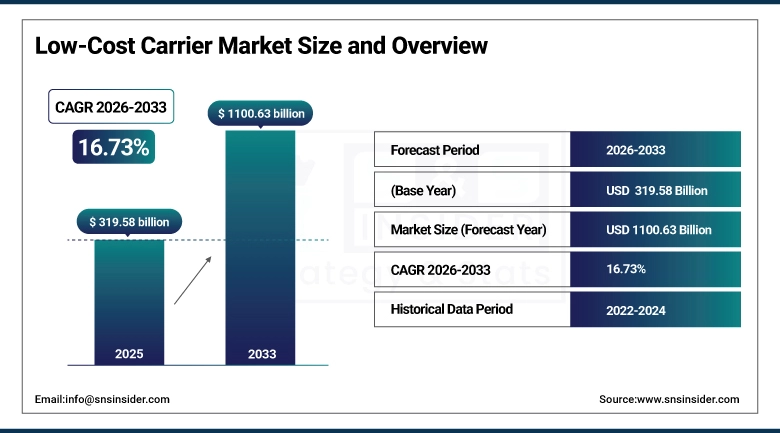 The Low-Cost Carrier Market Size was valued at USD 319.58 Billion in 2025E and is expected to reach USD 1100.63 Billion by 2033 and grow at a CAGR of 16.73% over the forecast period 2026-2033.