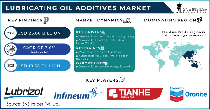 The Lubricating Oil Additives Market Size was valued at USD 19.66 billion in 2023 and is estimated to reach USD 25.66 billion by 2032 and grow at a CAGR of 3.0% over the forecast period 2024-2032.