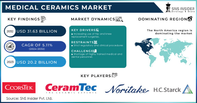 The Medical Ceramics Market Size was valued at USD 20.2 billion in 2023, and is expected to reach USD 31.63 billion by 2032, and grow at a CAGR of 5.11% over the forecast period 2024-2032.