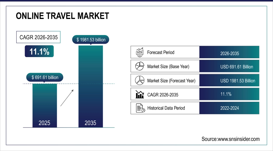 The Online Travel Market was valued at USD 691.61 billion in 2025 and is expected to reach USD 1981.53 billion by 2035, growing at a CAGR of 11.1% from 2026-2035.