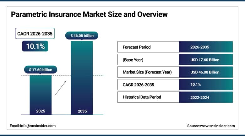 The Parametric Insurance Market Size was valued at USD 17.60 Billion in 2025 and is expected to reach USD 46.08 Billion by 2035 and grow at a CAGR of 10.1% over the forecast period 2026-2035.