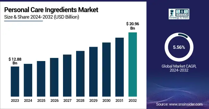 The Personal Care Ingredients Market size was USD 12.88 billion in 2023 and is expected to reach USD 20.96 billion by 2032 and grow at a CAGR of 5.56% over the forecast period of 2024-2032.