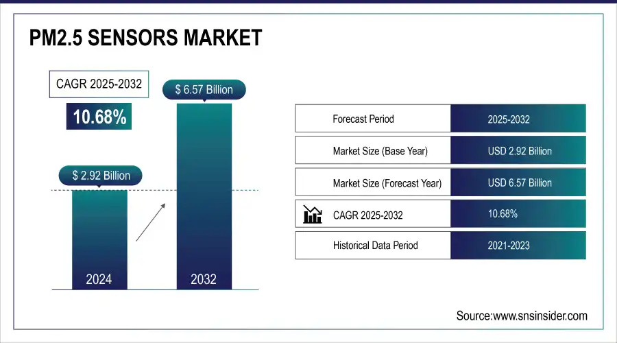 The PM2.5 Sensors Market size was valued at USD 2.92 Billion in 2024 and is projected to reach USD 6.57 Billion by 2032, growing at a CAGR of 10.68% during 2025-2032.