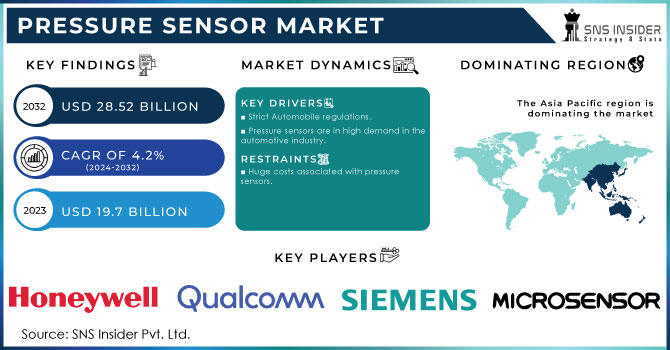 The Pressure Sensor Market Size was valued at USD 19.7 billion in 2023 and is expected to reach USD 28.52 billion by 2032 and grow at a CAGR of 4.2% over the forecast period 2024-2032.