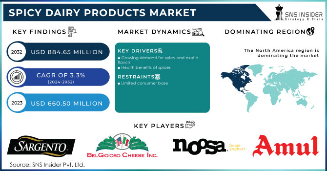 The Spicy Dairy Products Market size was USD 660.50 million in 2023 and is expected to Reach USD 884.65 million by 2032 and grow at a CAGR of 3.3 % over the forecast period of 2024-2032.