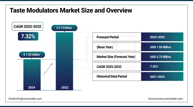 The Taste Modulators Market size was valued at USD 1.55 billion in 2024 and is projected to reach USD 2.73 billion by 2032.