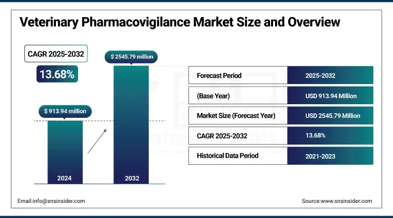 The veterinary pharmacovigilance market size was valued at USD 913.94 million in 2024 and is expected to reach USD 2545.79 million by 2032, growing at a CAGR of 13.68% over 2025-2032.